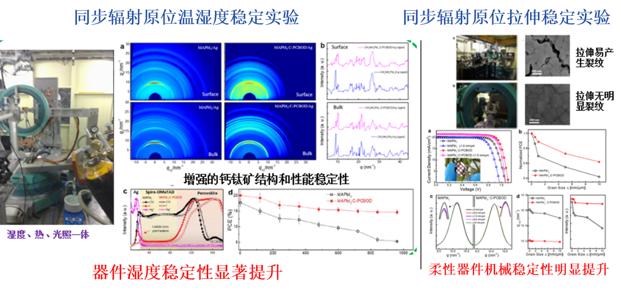 针对这一典型问题,中科院上海高等研究院杨迎国博士(一作)、高兴宇研究员等与苏州大学廖良生王照奎教授课题组李萌博士(一作)、德国赫姆霍兹国家实验室Antonio Abate(通讯作者)等合作,顺利获得在钙钛矿前驱体溶液引入富含不饱和有机基团的富勒烯衍生物C-PCBOD,并结合紫外光进行钙钛矿晶粒的光铰联,实现了钙钛矿晶粒间的有效链接和薄膜内部缺陷的有效钝化。基于同步辐射掠入射XRD和小角散射发现,光铰联形成的钙钛矿薄膜晶粒尺寸更大且晶面择优取向更好,从薄膜表面到体的晶粒尺寸分布更均一,是器件效率大幅提升的关键因素。基于同辐射湿度实验和外载力条件下的同步辐射原位拉伸和弯曲实验,我们发现光铰联后的钙钛矿薄膜的机械稳定性更好,器件效率可以很好保持主要归因于薄膜较好的结构稳定性,适合大面积柔性器件产业化开展。相关工作发表在国际权威期刊Advanced Materials(2019, 1901519)上。