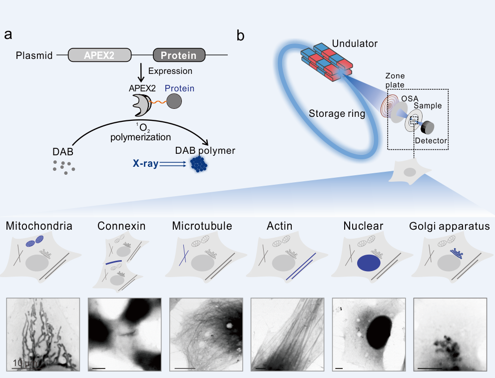 近期,上海光源科学中心研究员诸颖、胡钧、王丽华和上海交通大学教授樊春海院士的联合团队开展了一种X射线遗传编码探针,成功在同步辐射X射线显微镜上实现了对细胞内特定蛋白质的内源标记和原位纳米分辨成像。该研究成果近期以Genetically encoded X-ray cellular imaging for nanoscale protein localization为题发表于《国家科学评论》上(National Science Review,2020,DOI: 10.1093/nsr/nwaa055)。