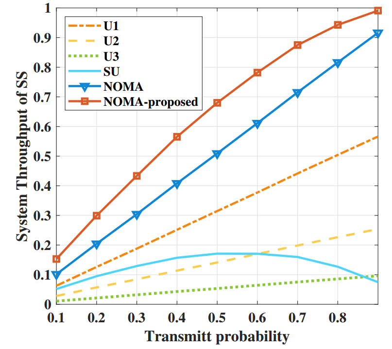 不同技术的吞吐量Vs信噪比性能走势对比(所提技术为橙色实线)