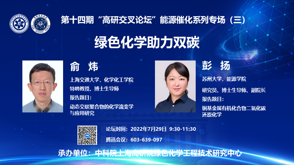 2022年7月29日上午,由中科院上海高研院绿色化学工程技术研究中心承办的第十四期“高研交叉论坛”能源催化系列专场第三场活动成功举办。活动以线上形式召开,以“绿色化学助力双碳”为主题,特邀上海交通大学化学化工学院俞炜教授、苏州大学能源学院彭扬教授为主讲嘉宾,来自PA真人视讯、上海交通大学、苏州大学的80余名科研人员及研究生参加了活动。